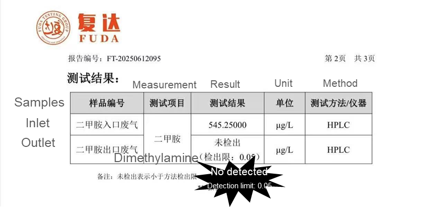 The exhaust gas is heated by a heat-exchanger to be 30~40, then it is filtered by two filters with accuracy of 10μm and 1μm respectively,and then sent to the PTFE membrane at pressurize of 0.4bar to remove dimethylamine.