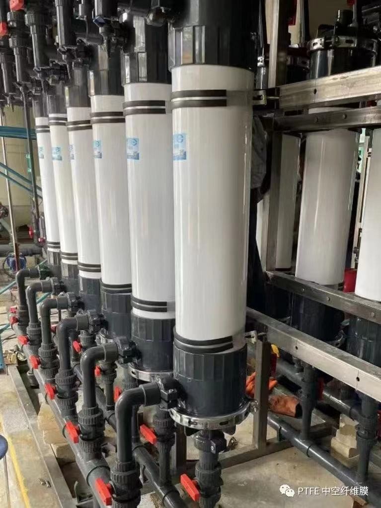 經過分析研究,發現其膜脫氨使用中的問題是膜組件采用的PP材料的問題。PP材料雖然具有材料成本低和制膜技術簡單等優點,但PP膜有機廢水中使用存在壽命短,易產生溶脹,潤濕、斷絲等問題。此制藥廠發現PP膜問題后,全部換用南京中科碧盾新膜的PTFE脫氨膜組件,PTFE材料又名特氟龍,即不粘鍋的材料,本身具有抗溶脹、強疏水、高強度、耐腐蝕、抗污染等特點,使用壽命長、脫氨效率高等優點,克服了上述膜脫氨在使用中問題。